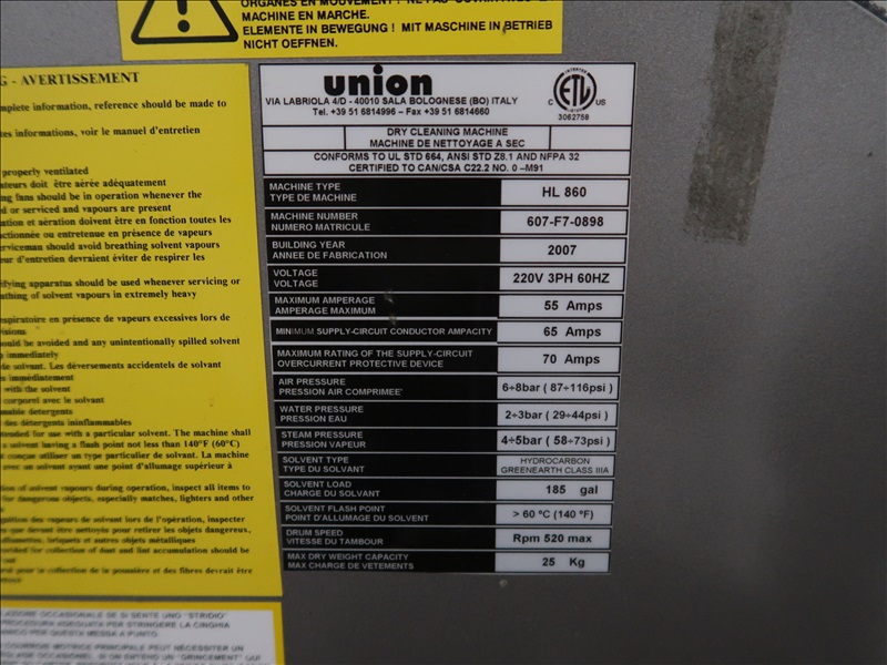 COMMERCIAL DRY CLEANING MACHINE W/DIALOG 700 ELECTRONIC CONTROLS, 25KG MAX DRY WEIGHT CAP, 220V, 3 PHASE, 60HZ