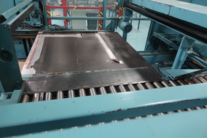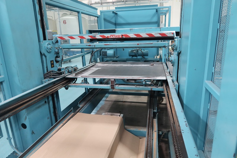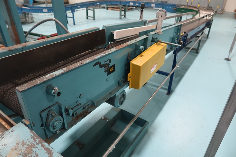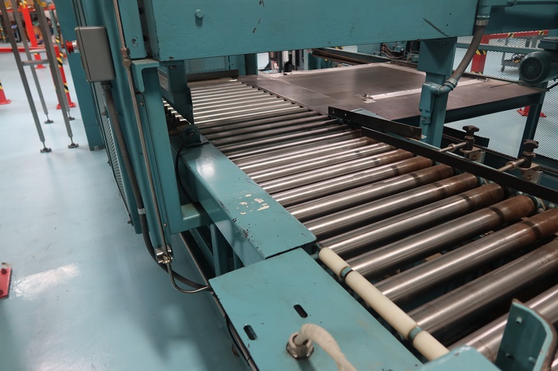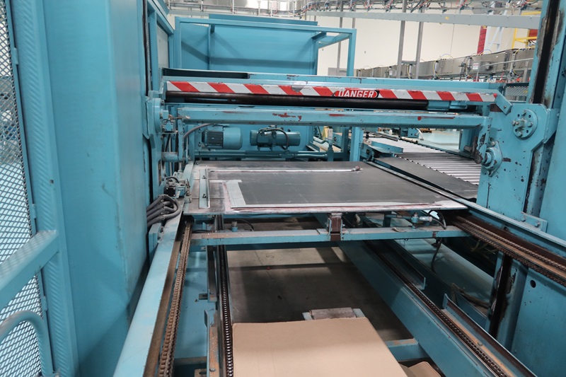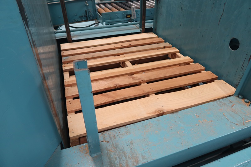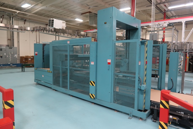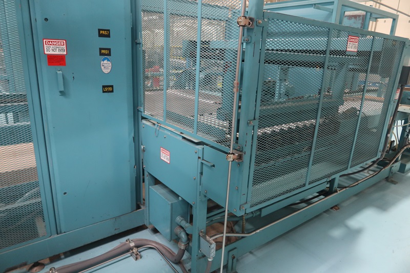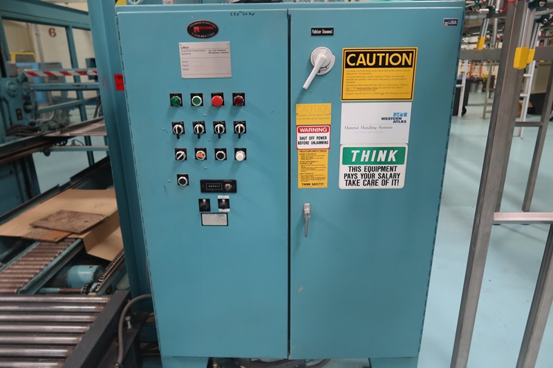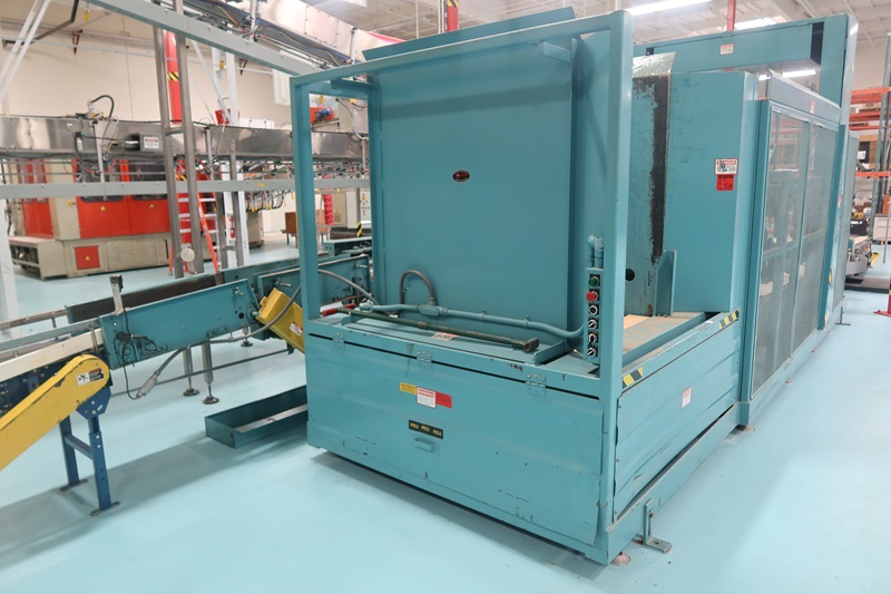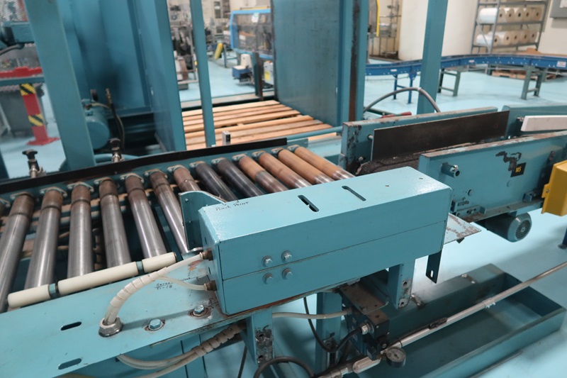 SINGLE LANE PALLETIZER, 72"X 12" INFEED BELT CONVEYOR, 132"X26" POWER ROLLER CONVEYOR, 60"X58" CHAIN DRIVEN HEIGHT ADJUSTABLE TABLE, 2-STRAND BOTTOM CHAIN CONVEYOR TO OUTFEED ROLLER CONVEYOR, 220V, 60AMP, 3-PHASE
