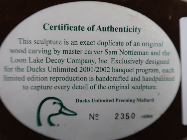 "PREENING MALLARD" DUCK'S UNLIMITED SCULPTURE BY SAM NOTTLEMAN 2350/4000 W/CERTIFICATE OF AUTHENTICITY