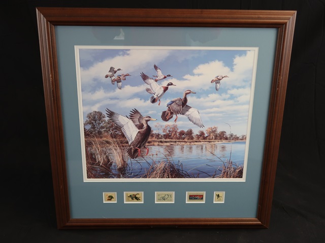 "ABRUPT DEPARTURE" FRAMED PRINT W/STAMPS BY DAVID MAASS, 22-1/2" X 22-1/2"