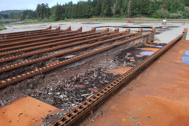 APPROX 42' 5-STRAND 4-1/2"X4-1/2" H-CHAIN LOG DECK, S-DRIVE, (2) PIN STOPS, MARKED STEEL PLATE & SUPPORTS TO GROUND