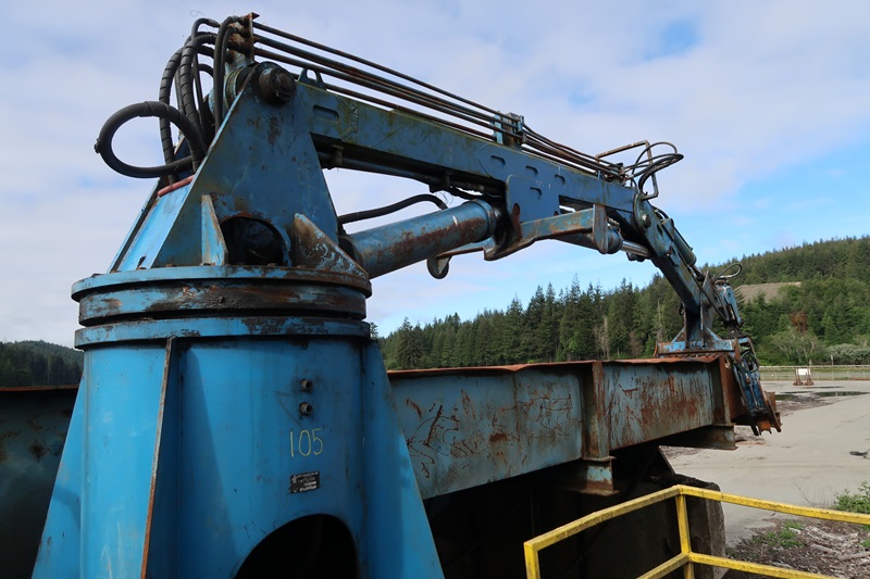HYDRAULIC OPERATED PEDESTAL MOUNT LOG LOADER W/LIVE HEEL, 25' BOOM, 7,700 LB CAPACITIES, 44" GRAPPLE W/CONTROLS IN CAB (HYDRAULIC UNIT SOLD AT LOT 127)