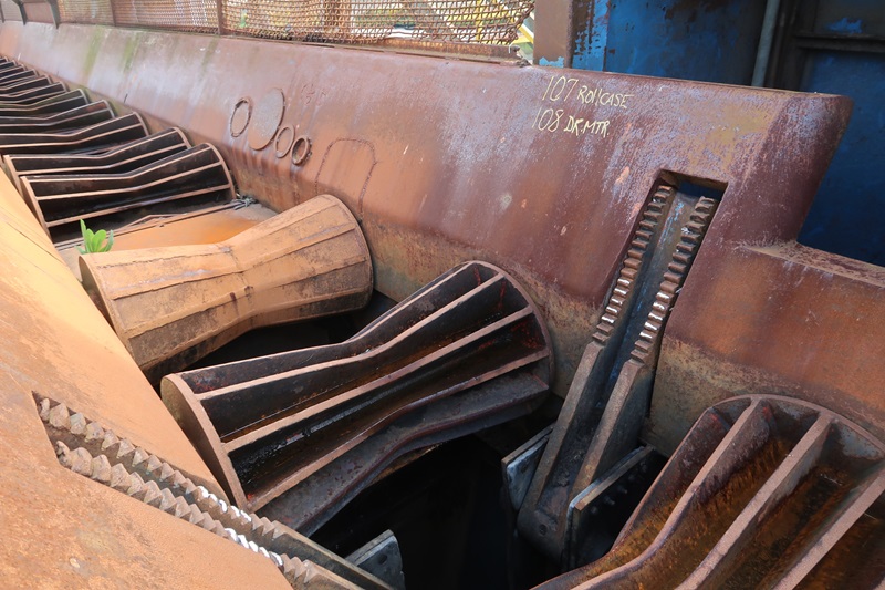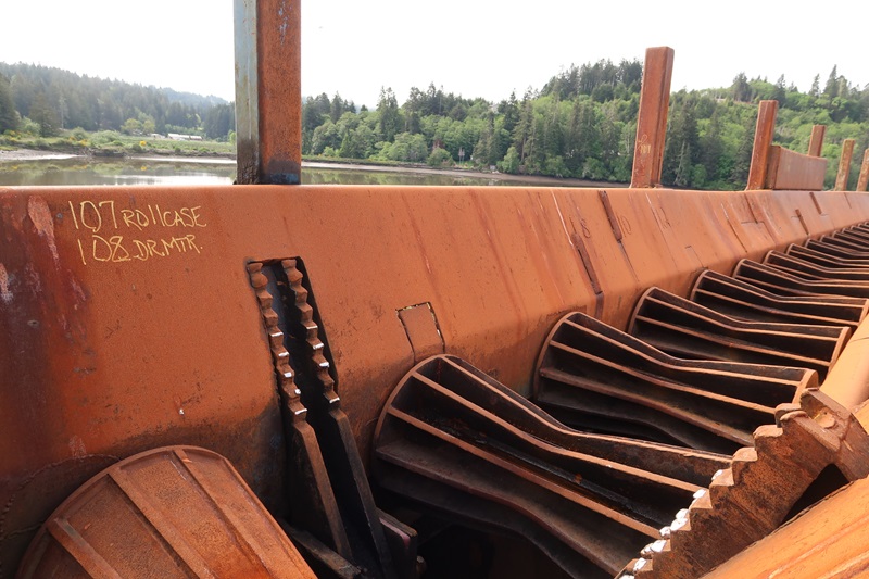 APPROX 70' POWERED INFEED & OUTFEED ROLLCASE (TO CUT OFF SAW) W/APPROX (24) 36" HOURGLASS ROLLS, IN & OUTFEED HOLD DOWNS, OUTFEED POP UP STOPS (NO SUPPORTS)