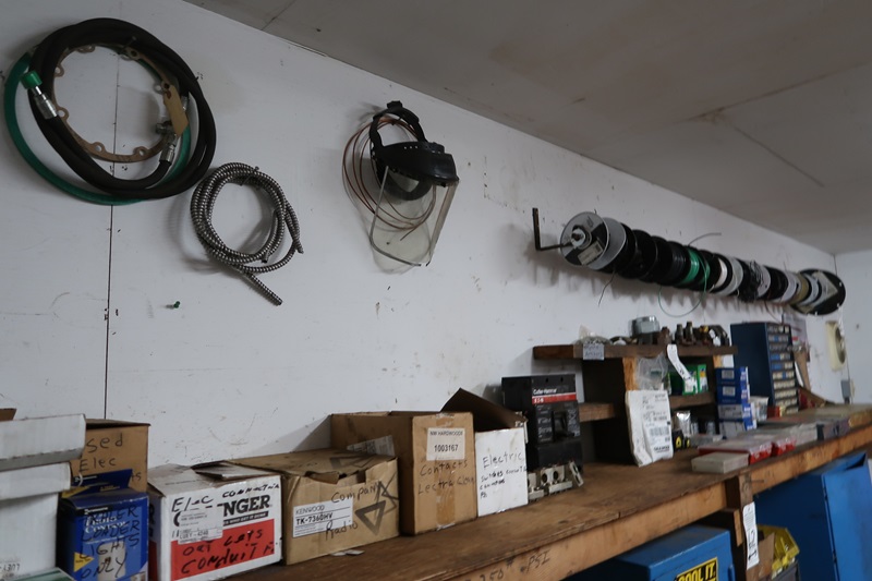 LOT, ASSORTED WIRE, FITTINGS & ASSORTED ELECTRICAL ON TOP SHELF W/ASSORTED ITEMS IN CORNER (NO WOOD SHELF)