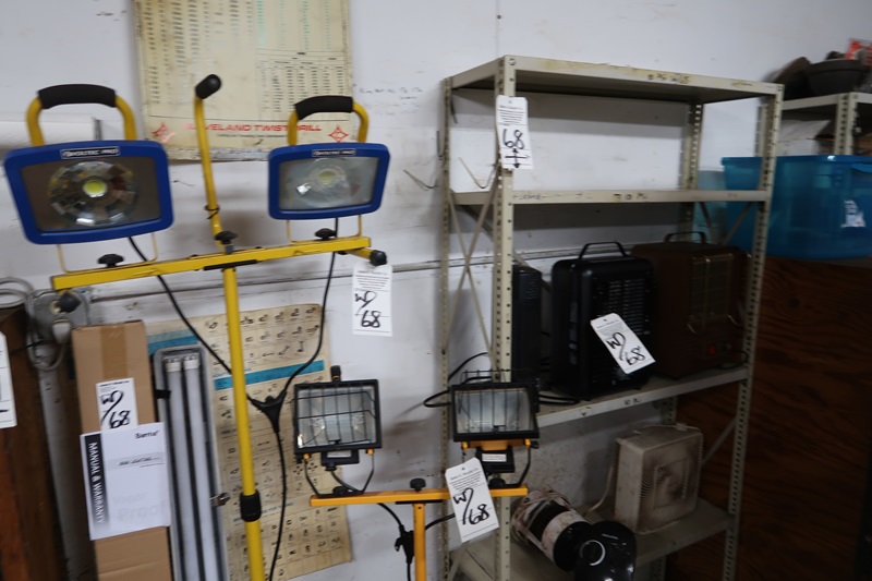 LOT, ASSORTED LIGHTS & HEATERS W/METAL SHELF
