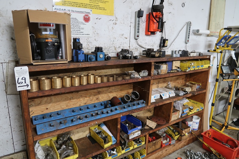 LOT, VALVES, BRASS STOCK, HYDRAULICS & ASSORTED FITTINGS W/WOOD SHELF