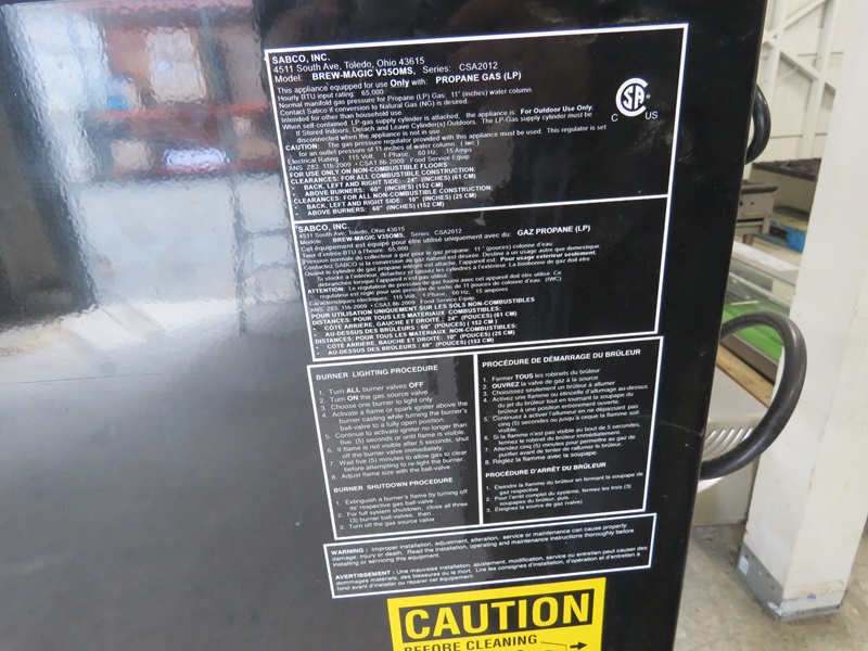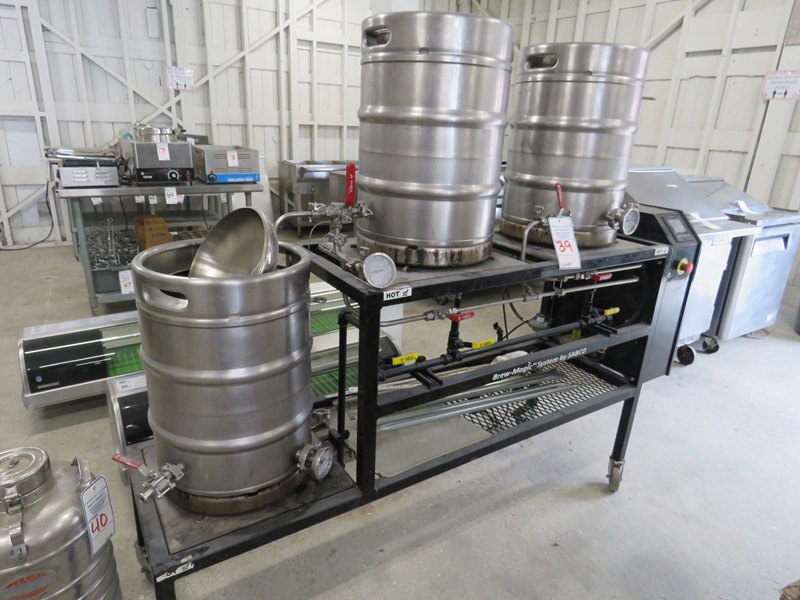 LOT, SABCO BREW-MAGIC V350MS 3-VESSEL SYSTEM TO INCLUDE: HLT, MASH TUN W/GRAIN DUMP, BOIL KETTLE, (2) MAGNETIC DRIVE SS PUMPS & 7" HIGH-DEF COLOR TOUCHSCREEN CONTROLLER, SERIES CSA2012