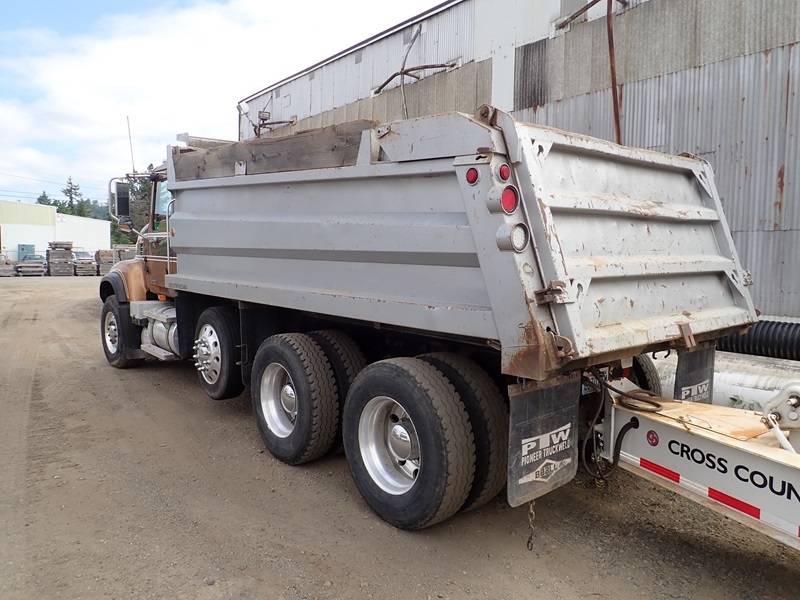 TRI/A DUMP TRUCK, 12.0L - 435HP, 18 SPD, CAMEL BACK SUSPENSION, DROP AXLE, 16' 6'' STEEL BOX W/HIGH LIFT GATE, PLUMBED FOR PUP