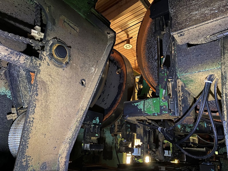 6' QUAD HIGH STRAIN BANDMILL SYSTEM, TEMPOSONIC POSITIONING, RELIANCE 150 HP/1,180 RPM/445T FRAME ARBOR DRIVES, DUAL KNURLED FEED THRU ROLLCASES, (2) SIDE ROLLS, BOTTOM SPLINE REMOVABLE HEAD, SUPPORT HYDRAULICS, ELECTRICS, SPARE PARTS & SAWS