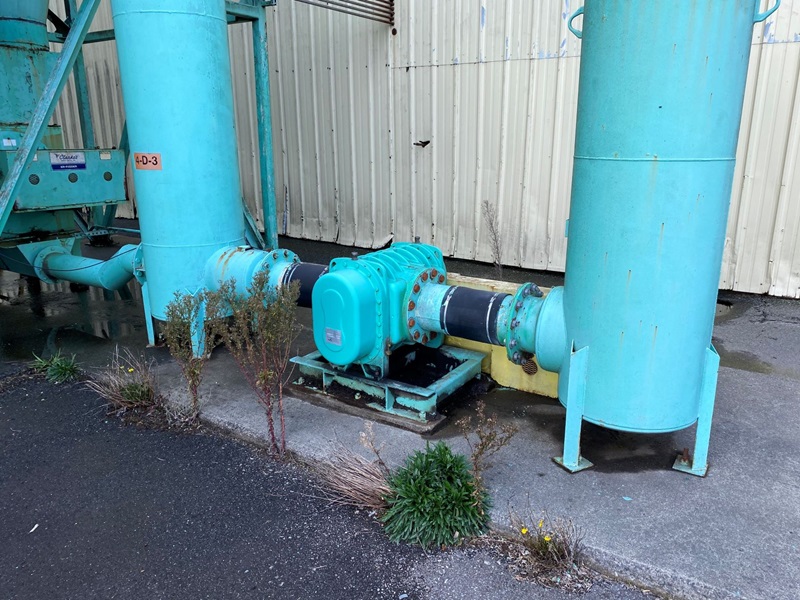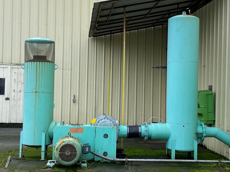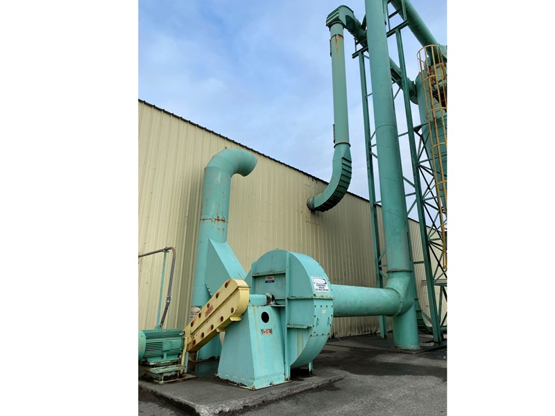 PLANER DUST COLLECTION SYSTEM W/CLARKES APPROX. 40" CBI FAN W/TOSHIBA 200 HP/1,780 RPM/447TZ FRAME MOTOR, FISHER KLOSTER MANXQ-120-42 CYCLONE SYSTEM TO CLARKES 30"X30" ER FEEDER W/MOTOR TO SHAFT MOUNTED REDUCER, STODDARD SILENCER, SUTORBILT GAGAEM 7"X21" BLOWER W/TOSHIBA 50 HP MOTOR, STODDARD 161H-10 SILENCER, HIGH & LOW PRESSURE BLOWPIPE (PLANER MILL)