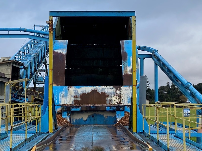 IN GROUND 50-TON CHIP TRUCK DUMP W/35' DECK, 30 HP HYDRAULIC UNIT, APPROX. 30' 4-STRAND 8"X11-1/2" BOX CHAIN TRANSFER CONVEYOR W/MOTOR TO SM CYCLO REDUCER, CONTROLS & ELECTRICS, SPARE CYLINDER IN SHOP (CHIP FACILITY)
