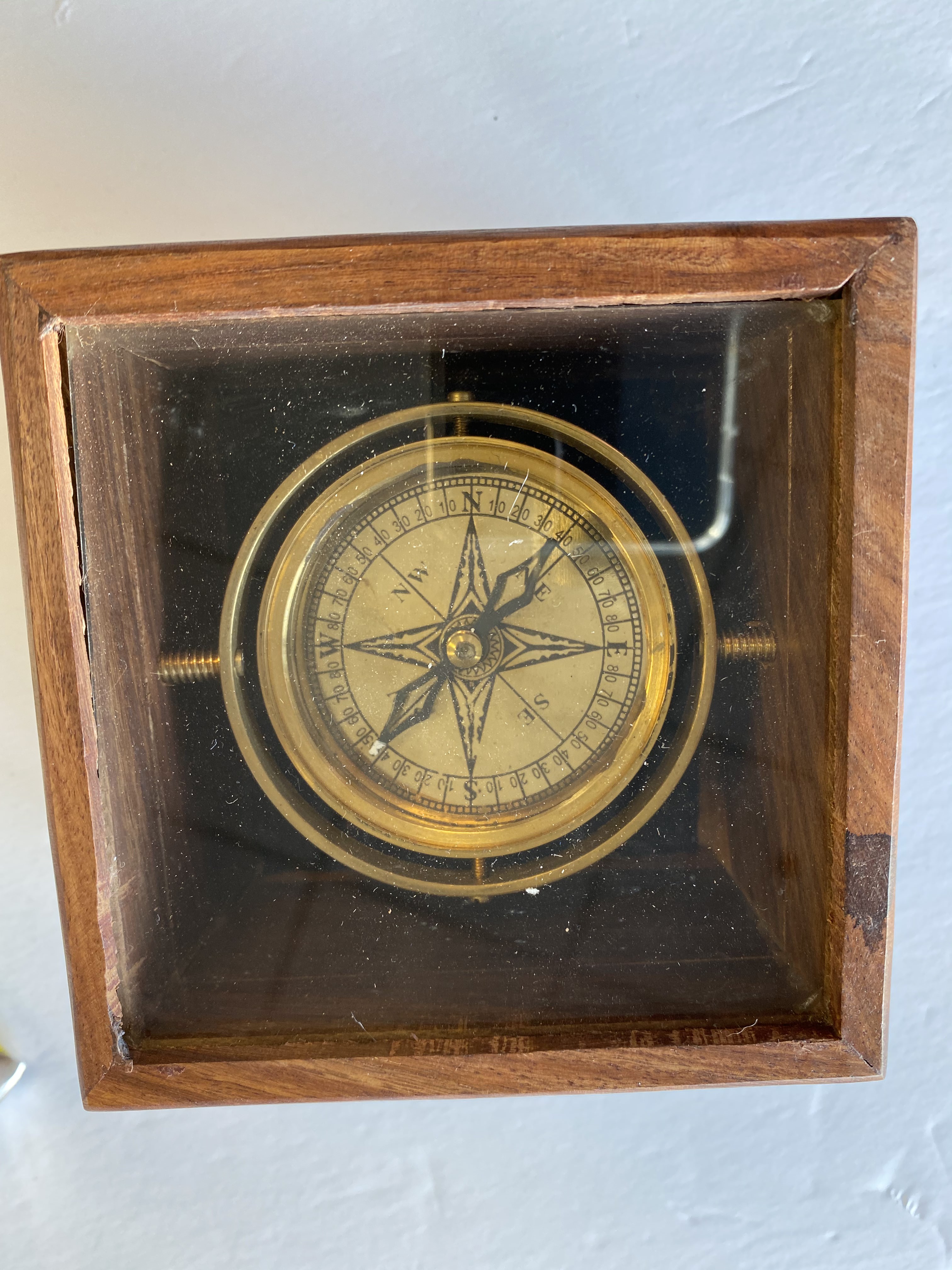 Brass compass in wooden box approx. 4.5" x 4.5" x 3.5"