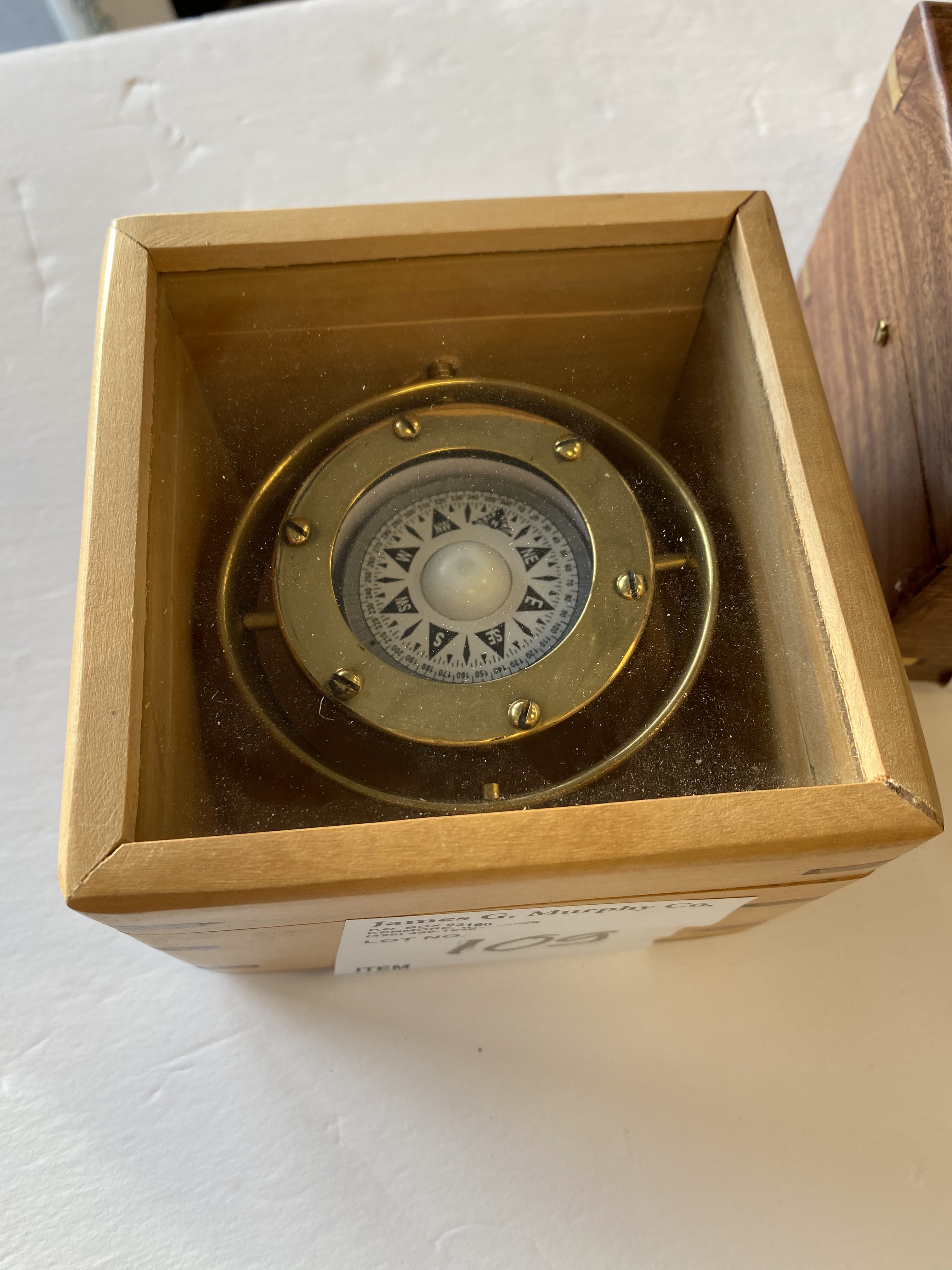 Brass compass in wooden box approx. 4.5" x 4.5" x 3.5"