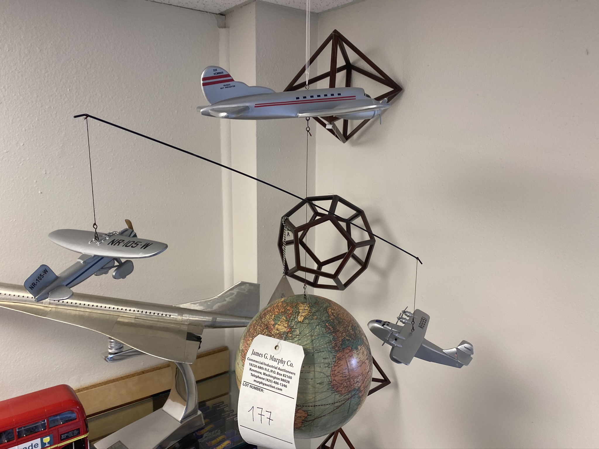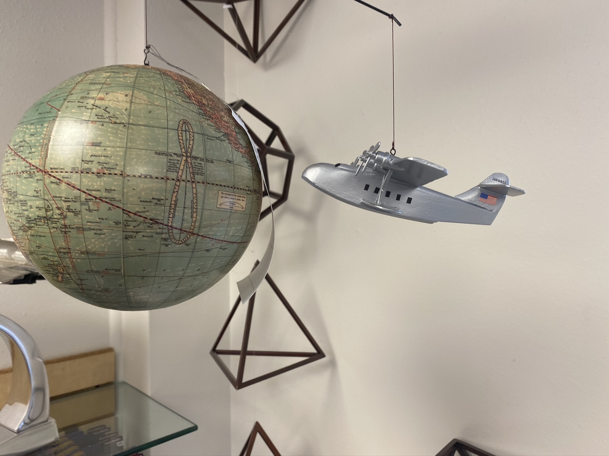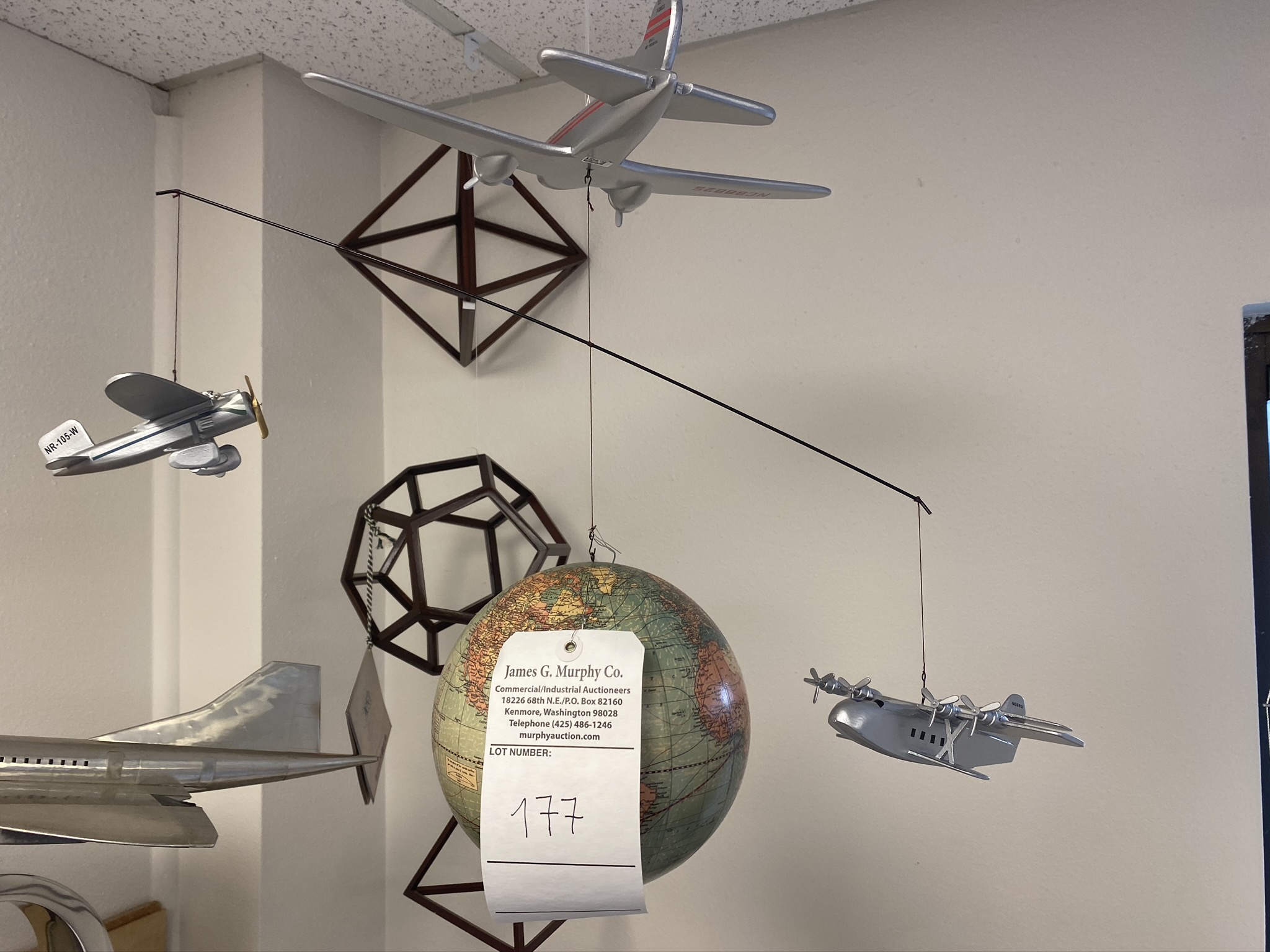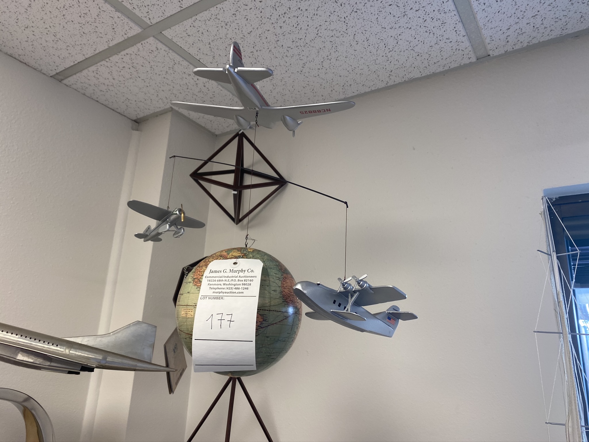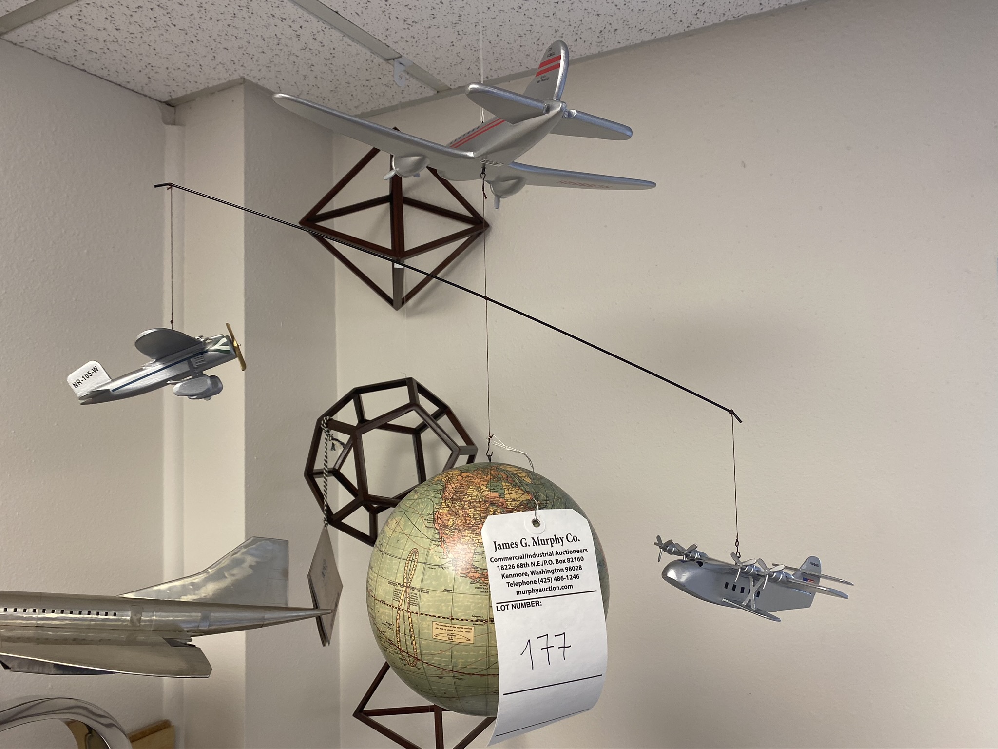 Set of 3 planes and 01 globe (Around The World Mobile) Approx. 13.60" x 26" x 15.70" Three wooden planes: Lockheed Winnie Mae, Pan Am China Clipper, and Douglas DC3 all gracefully glide around the 1920s globe.