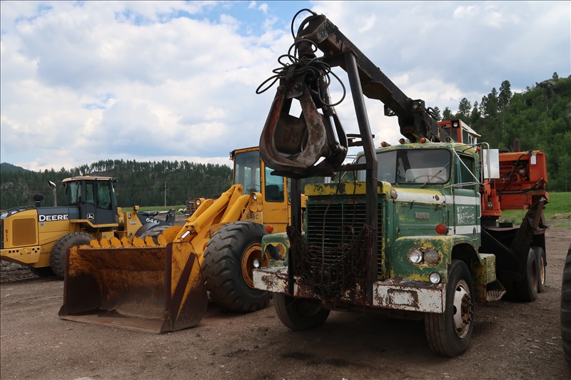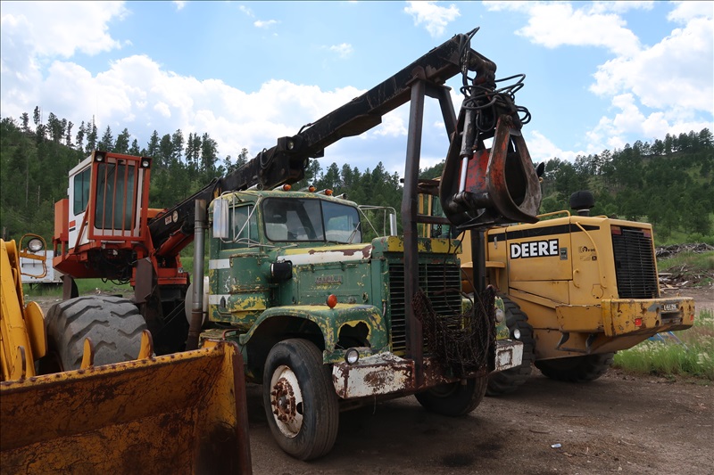 HYDRAULIC OPERATED LOG LOADER W/SWIVEL GRAPPLE, JOHN DEERE DIESEL ENGINE, HYDRAULIC PUMP & TANK, ENCLOSED CAB, DOWN RIGGERS MOUNTED ON 1972 KENWORTH TANDEM AXLE TRACTOR, DIESEL ENGINE, EATON FULLER TRANSMISSION