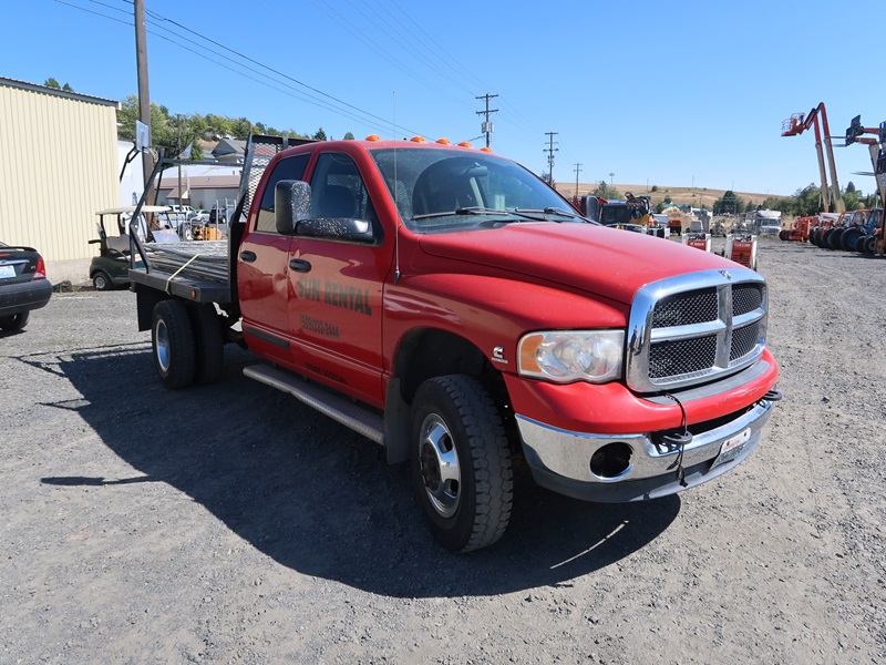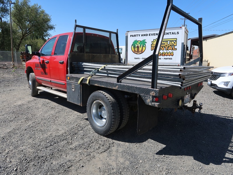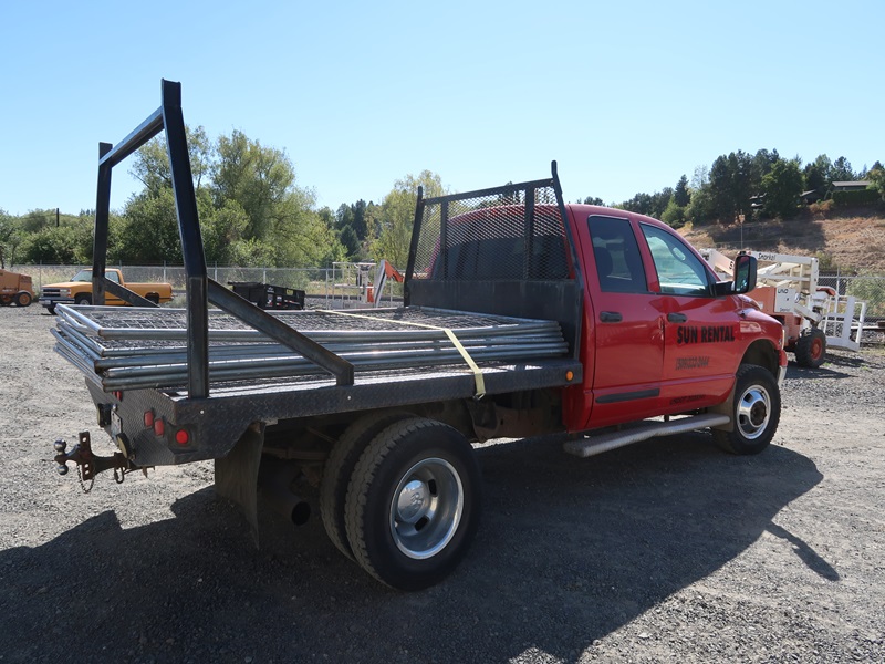 CREW CAB 4X4 FLATBED TRUCK, CUMMINS 6 CYL, 6 SPD, 8' BED W/RACK, PDL, PW, GOOSENECK READY