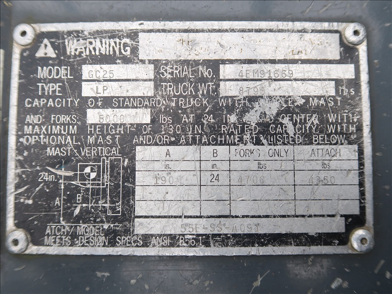5,000 LB HRT FORKLIFT, 190" FORK HEIGHT, 3-STAGE MAST, SIDE SHIFT, 4 CYL PROPANE (IDLES AT HIGH RPM, NEEDS REPAIR)