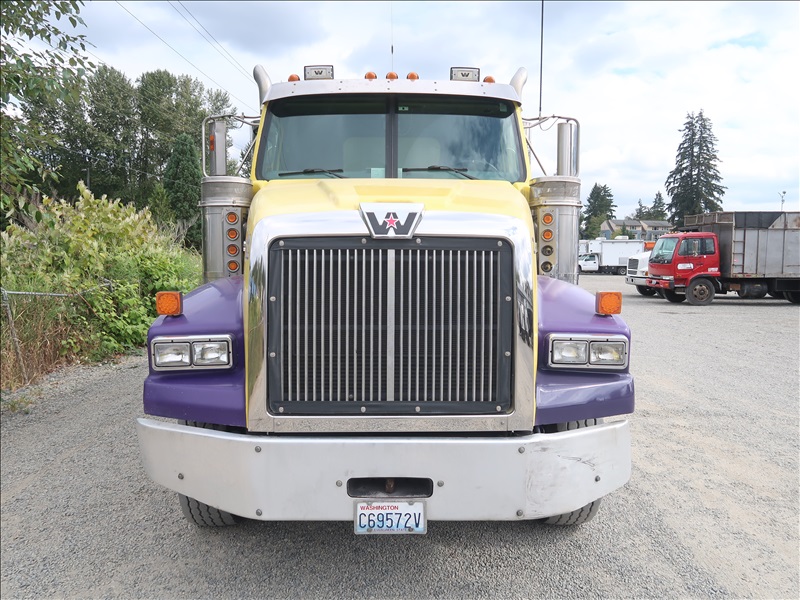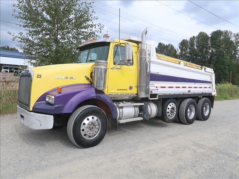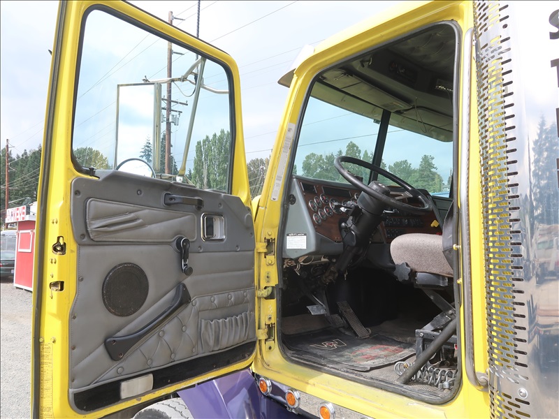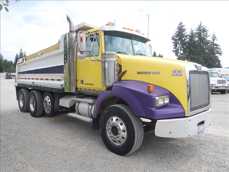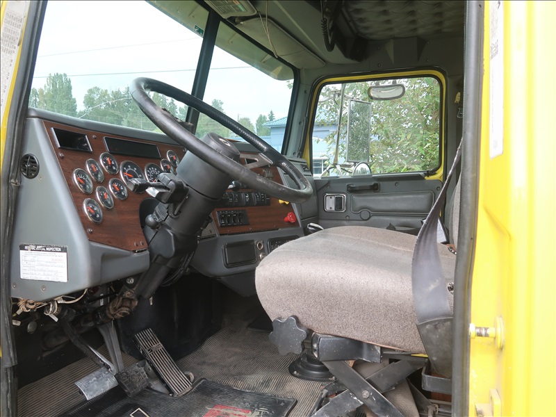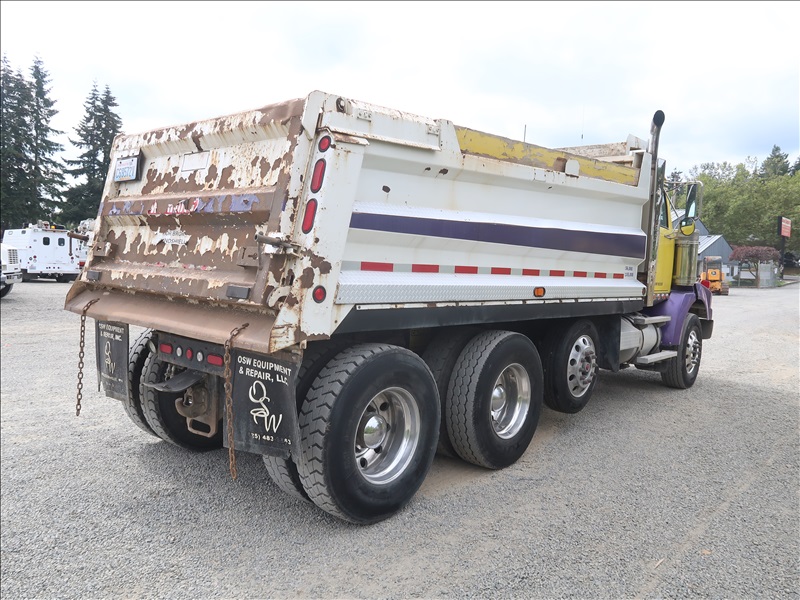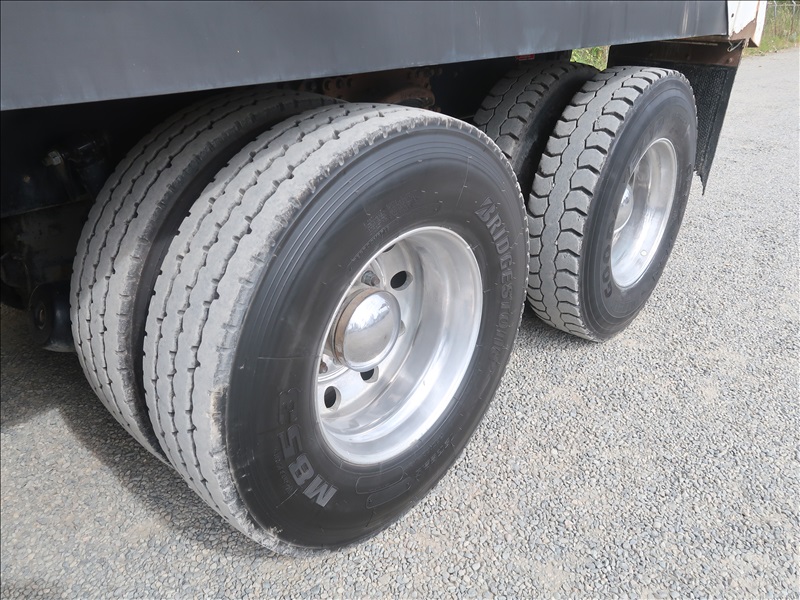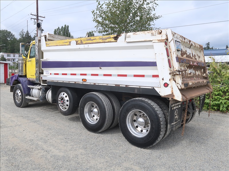TRI/A DUMP TRUCK, 16' STEEL BOX, HIGH LIFTGATE, DETROIT SERIES 6, 18 SPD, 218" W/B, 13,200 LB FRONT, 46,000 LB REARS, DROP AXLE, PLUMBED FOR PUP