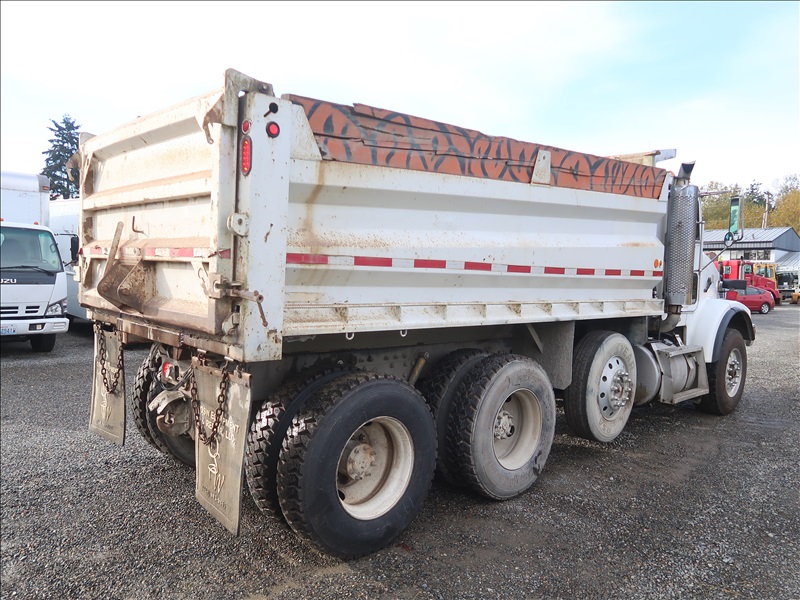 TRI/A DUMP TRUCK, 15' STEEL BOX, ASPHALT GATE, CUMMINS M11-370E, AUTO, CHALMERS SUSPENSION, 195" W/B, 18,000 LB FRONT, 40,000 LB REARS, DROP AXLE, PLUMBED FOR PUP