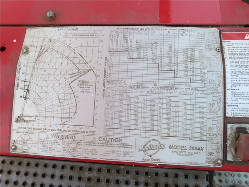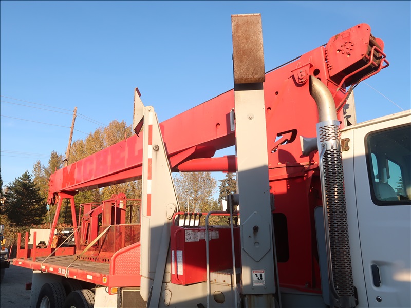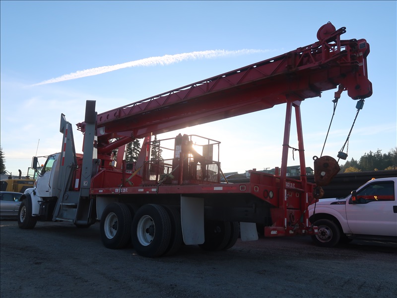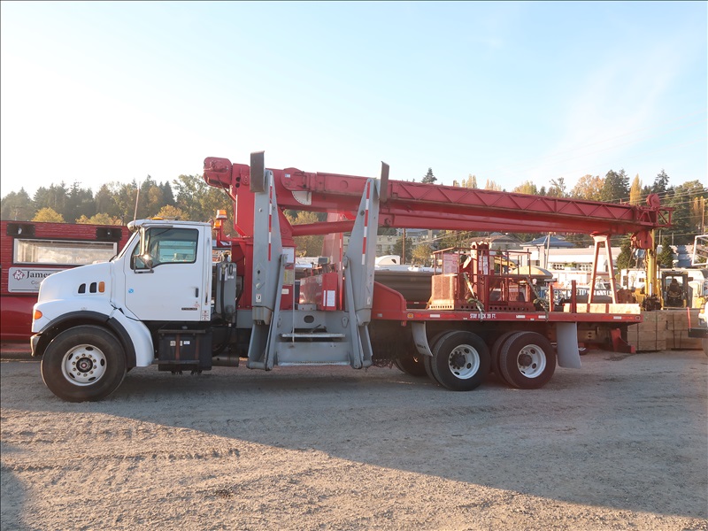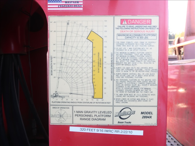 T/A, CRANE TRUCK, CAT 3126, 9 SPD, MANITOWOC PIONEER 2894X 55,000 LB 94' 4-SECTION BOOM, 44' EXPANDABLE JIB, ANTI 2-BLOCK, HOOK BLOCK, HEADACHE BALL, MAN BASKET, ATTACHMENT, STABILIZER, SPRING BEAM SUSPENSION, 20,000 LB FRONT, 40,000 LB REARS, 18' FLATBED