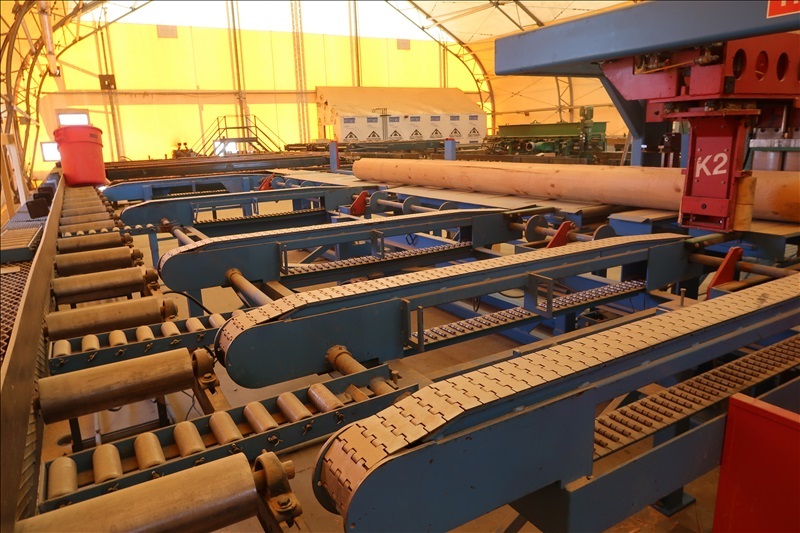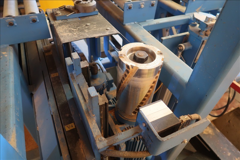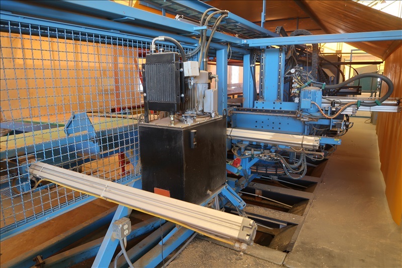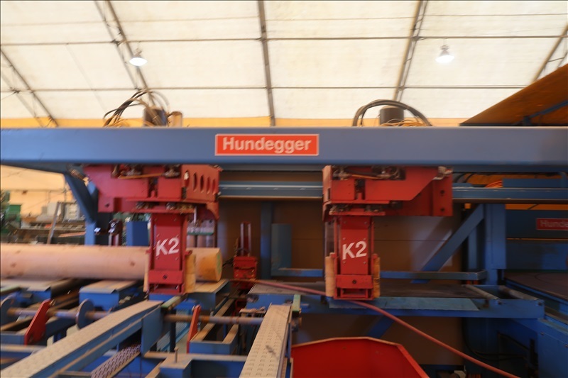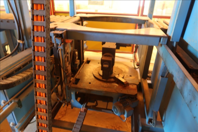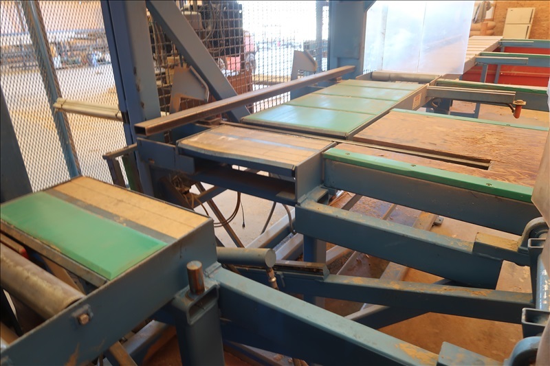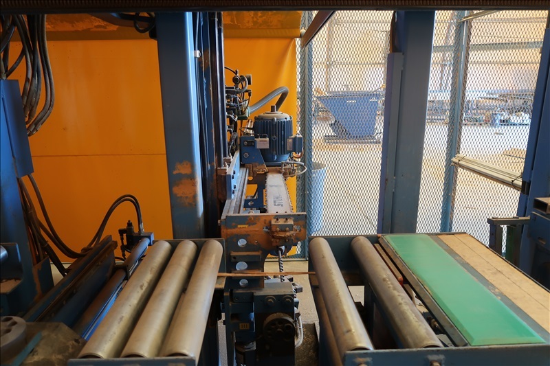 LOG JOINERY MACHINE, 20" MAX DIA, JUMP SAW STATION, UNIVERSAL MILLING STATION W/SINGLE HEAD, DUAL SPINDLE DRILLING STATION, HORIZONTAL CHAINSAW STATION, POWERED INFEED ROLLS, DUAL INDIVIDUAL LOG POSITIONING CLAMPS, (2) EJECTOR CLAMPS, ELECTRIC MOTORS, HYDRAULIC UNIT, CONTROLS & ELECTRICS, 7' 5-STRAND SLAT CHAIN INFEED, 35' OUTFEED TABLE W/KICK OUT