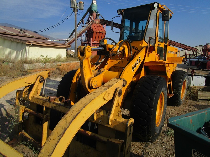 RUBBER TIRE LOADER, LOG FORKS W/TOP CLAMP, JOHN DEERE 6-CYLINDER TURBO DIESEL ENGINE, POWER SHIFT TRANSMISSION, 17.5-25 TIRES