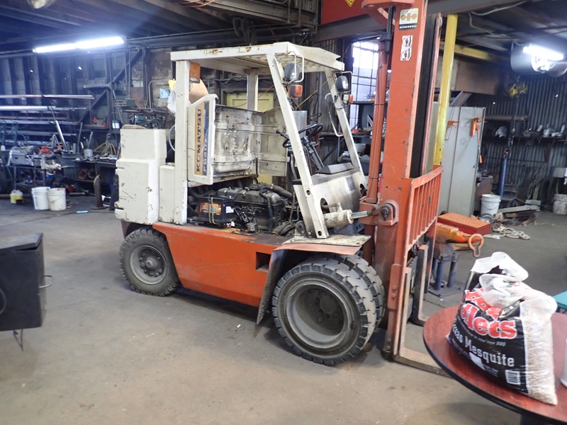 8,000 LB CAP. DUAL SOLID TIRED FORKLIFT, 2-STAGE MAST, SIDE SHIFT, PROPANE (NEEDS WORK)