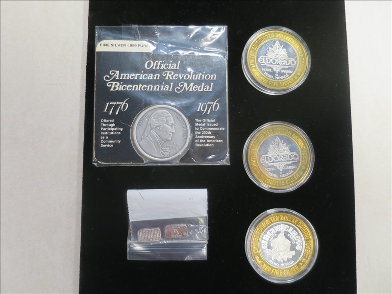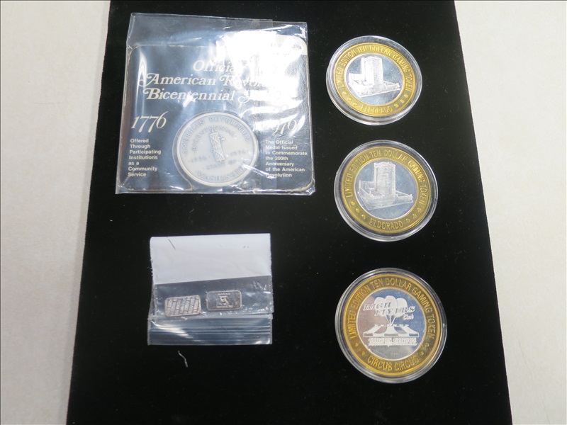 LOT, (3) GAMING TOKENS, (1) MEDAL & (2) SMALL BARS (3 OZ & .999 SILVER)