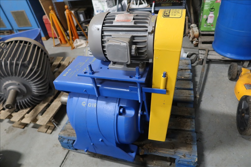 GEAR REDUCER, 20 HP RATED, 86.5:1 RATIO, 3" OUTPUT SHAFT, WITH GE 5 HP, 1,750 RPM, 185 "T" FRAME MOUNTED OVERHEAD, 4 1/2" 2 GROVE 3V X 56" BELT DRIVE TO INPUT GEARHEAD, 6" 2 GROVE 3V DRIVEN SHEAVE, 15 RPM FINAL OUTPUT SHAFT WITH EXISTING SHEAVES