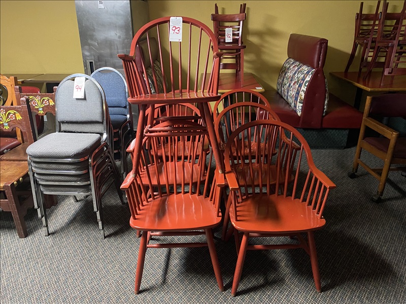 LOT, (7) SPINDLE BACK WOOD DINING CHAIRS (IN BASEMENT)