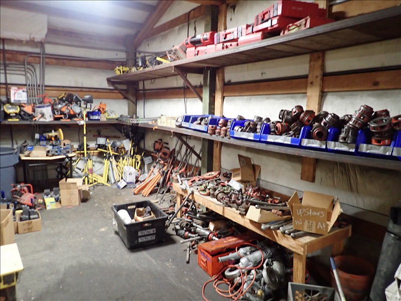 GROUP OF RIDGID 700 MACHINES, 1/2-2" DIES, TEMP LIGHTS, REAMERS, PIPE CUTTERS, STRING LIGHTS, POWER TOOLS, SPIDER BOXES & MISC. TOOLS
