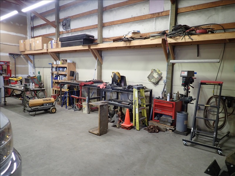 GROUP OF SHOP AREA TO INCLUDE: INGERSOLL RAND COMPRESSOR, DAYTON DRILL PRESS, CREEPER, CHOP SAW WITH IN/OUTFEED TABLE, JACKS, STEEL TABLE, OXY/ACETYLENE SET, SHOP PRESS & MISC. SHOP SUPPLIES