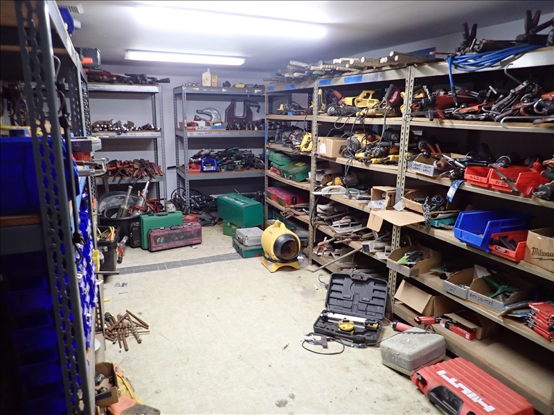 GROUP OF TOOL ROOM TO INCLUDE: POWER TOOLS, PUNCHES, PORTAPOWERS, PIPE WRENCHES, PIG TAILS, SOCKETS, WRENCHES, RIDGID 700 MACHINES, KNOCK OUTS & ASSORTED HAND TOOLS