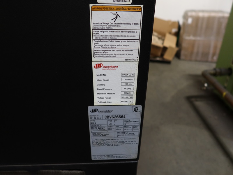 ROTARY SCREW AIR COMPRESSOR, 4,175 ROM, 109 CFM CAPAVITY, 150 PSIG, 380/400/460V, 3-PHASE, HOUR METER READS:28,341, S/N:CB626664