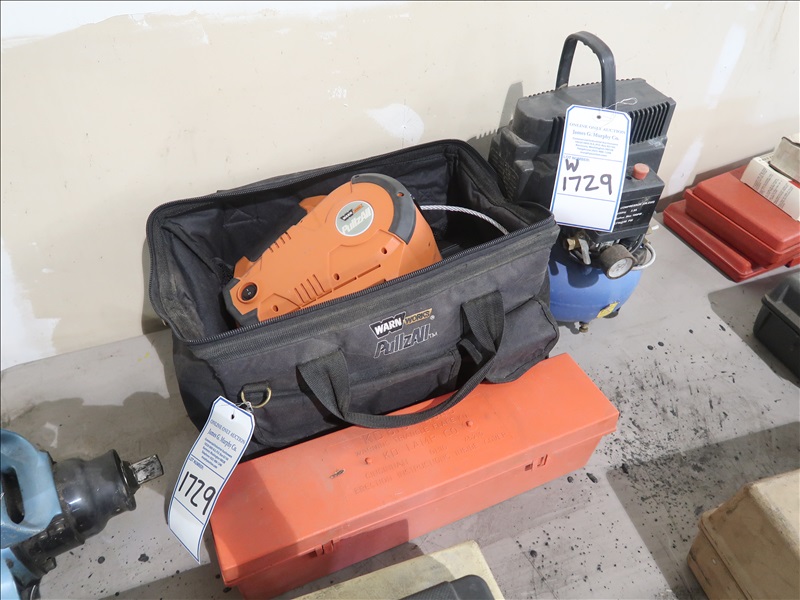 LOT, HANDHELD CORDLESS WINCH W/SOFT CASE, (1) 120V SMALL AIR COMPRESSOR & (1) BOY WARNING TRIANGLES