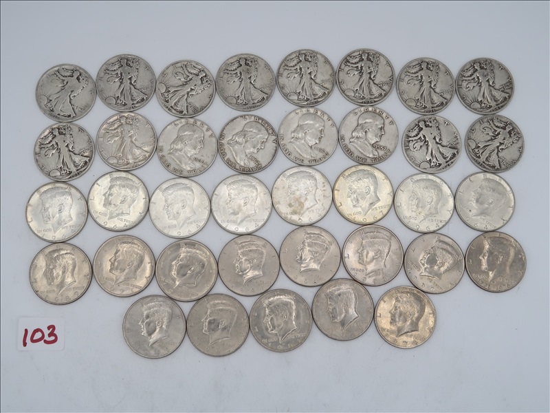 LOT, APPROX (12) WALKING LIBERTY, (4) FRANKLIN, & (21) KENNEDY HALF DOLLARS
