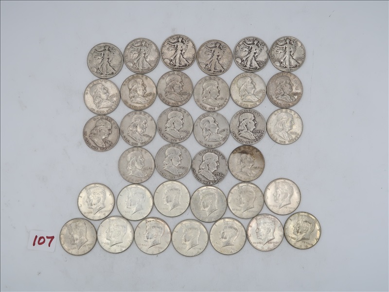 LOT, APPROX (6) WALKING LIBERTY, (16) FRANKLIN, & (13) KENNEDY HALF DOLLARS