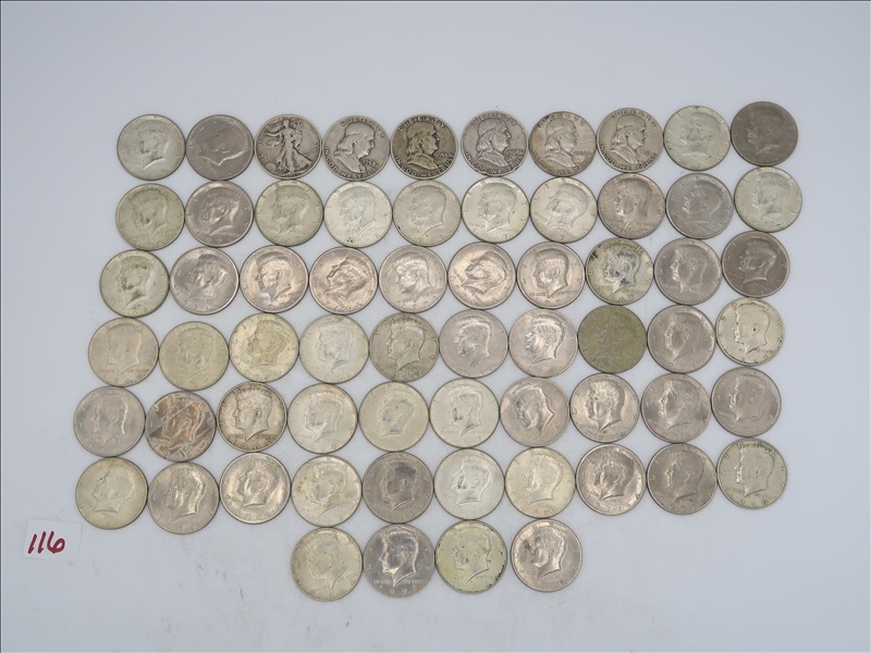 LOT, APPROX (1) 1946 WALKING LIBERTY, (5) FRANKLIN, & (58) KENNEDY HALF DOLLARS