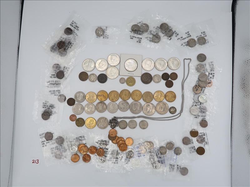 LOT, APPROX (3) IKE, (6) SUSAN B ANTHONY, & (8) SACAGAWEA DOLLARS, (1) 1942 LIBERTY WALKING, & (7) KENNEDY HALF DOLLARS, (1) MERCURY, (14) 1964 & PRIOR, & (3) ROOSEVELT DIMES, (1) 1872 LIBERTY SEATED HALF DIME, (8) BUFFALO, (4) V, (1) WAR, & (4) 1964 & PR