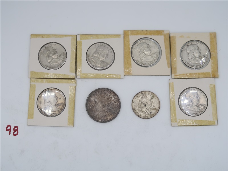 LOT, (1) 1888 MORGAN SILVER DOLLAR & (7) FRANKLIN HALF DOLLARS