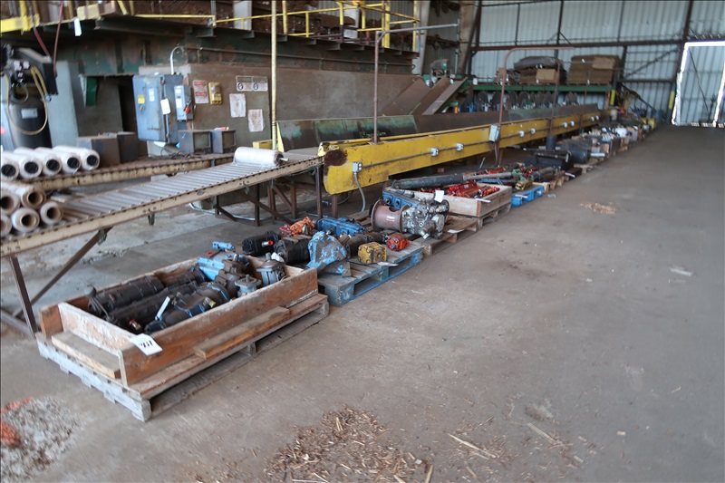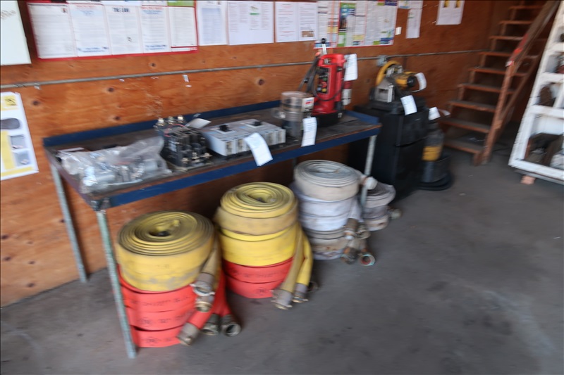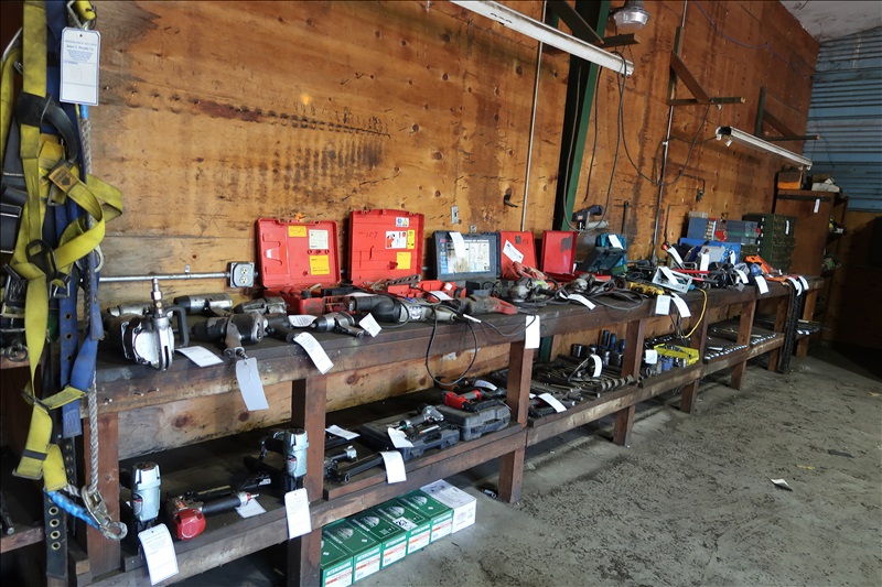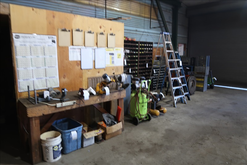 SHOP & MISC. EQUIPMENT TO INCLUDE: WELDERS; FOLDING CRANE; ENGINE STAND; COMPRESSOR; PIPE THREADING TOOLS; CHOP SAW; (3) CHAINSAWS; AIR & POWER TOOLS; 2 TON CHAIN HOIST; FLAMMABLES CABINETS; GRINDERS; STEEL TABLES & VISES; HYDRAULIC JACKS; PARTS WASHER; 25 HP HYDRAULIC SPLITTER; (14) FIREWOOD BUNDLERS; (2) TURNTABLES; STACKING FRAMES; AIR RECEIVERS; (2) WHEELED FIRE EXTINGUISHERS; GRIZZLY SCREEN; 150 HP HYDRAULIC UNIT; SELF-DUMPING DUMPSTERS; STEEL BINS; CATWALK & STAIRS