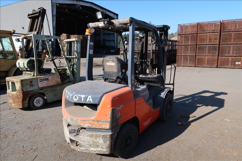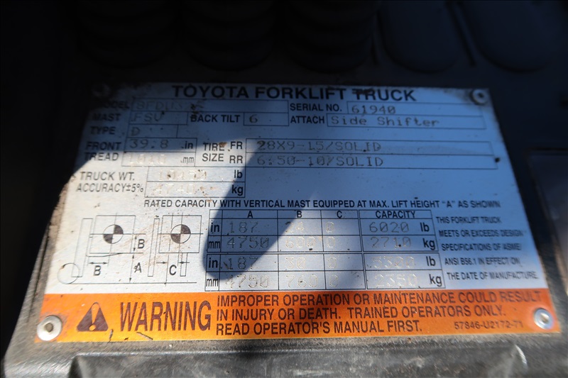 6,020 LB. CAPACITY FORKLIFT, DIESEL ENGINE, 187" 3-STAGE MAST, SIDE SHIFT, 48" FORKS, SOLID TIRES