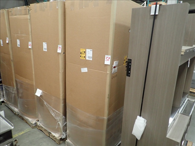 48"W X 76" TALL X 22" CUSTOM BUILT COFFEE BAR W/(2) SLIDING SS SHELVES, CUP DISPENSER, SUPPLY DISPENSERS & TRASH BIN (UNUSED)