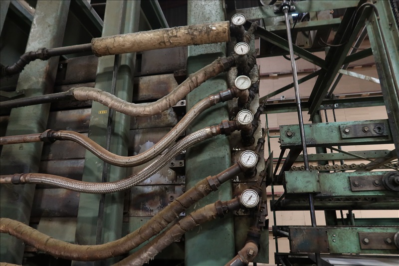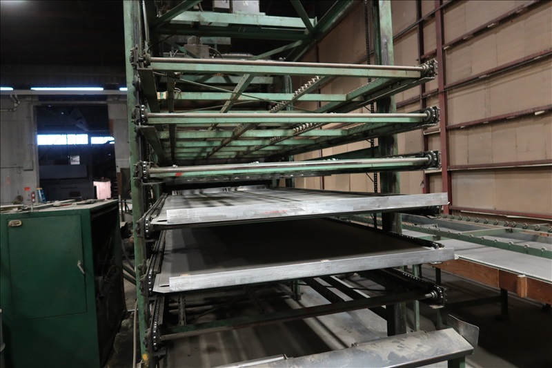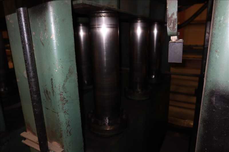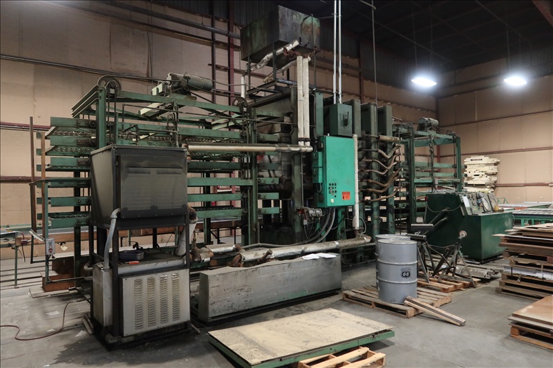 HOT PRESS (6) 72"X164" PRESSURIZED PLATENS, (6) PRESS STATIONS W/(3) HYDRAULIC CYLINDERS EACH, PRESSURE GAUGES, (2) VIKING 120 OIL PUMPS, ELECTRIC OIL HEATER, (6) 16' INFEED TABLES, (6) 16' OUTFEED TABLES, BARTLOW INLINE TEMPERATURE CONTROLS, HONEYWELL MASTER TEMPERATURE CONTROLS, 40-15 HP, 440V, 3 PHASE