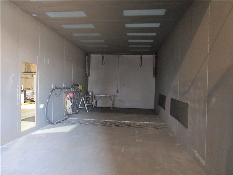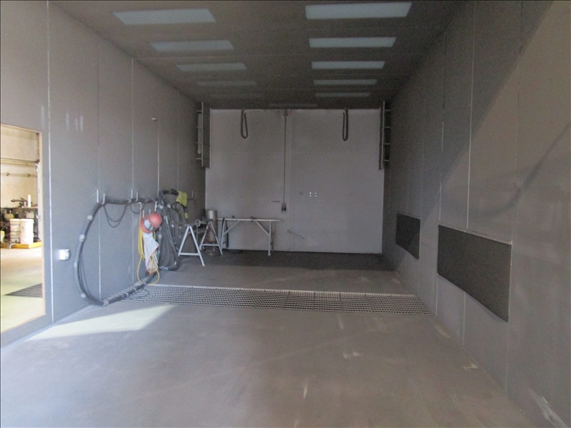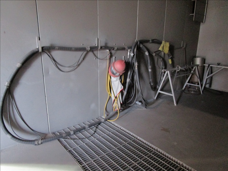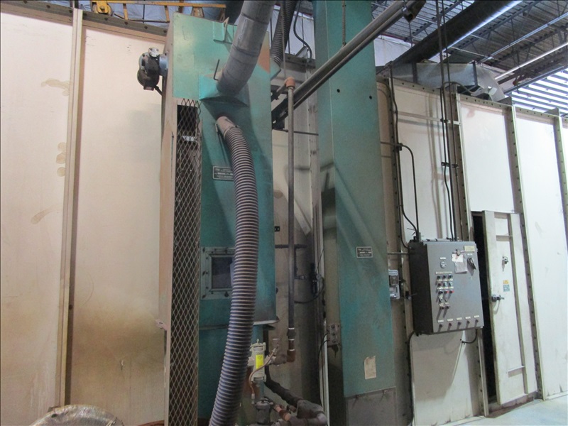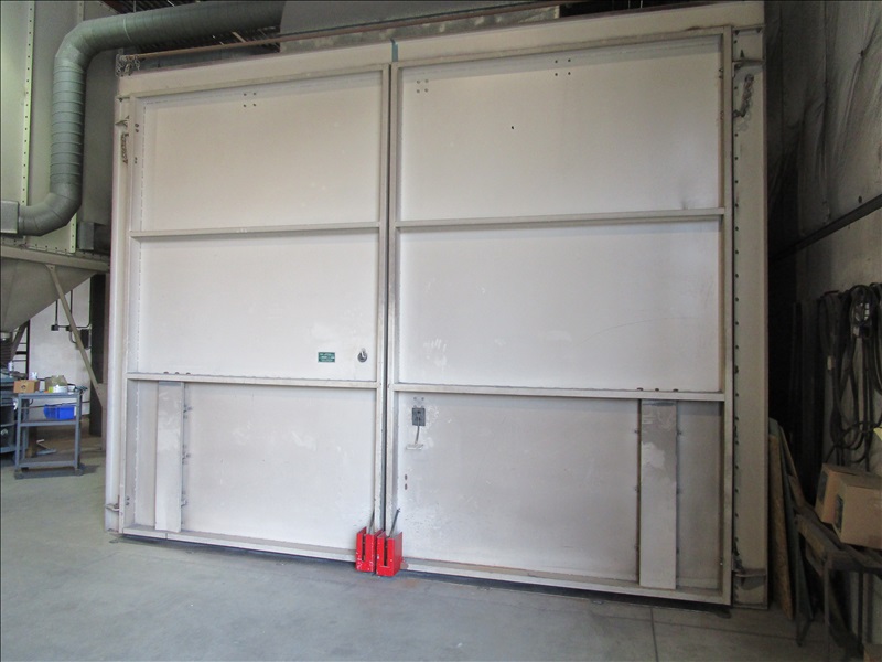 ABRASIVE BLAST BOOTH, 15'WX30'L W/BUCKET ELEVATOR, CLEMCO MOD 2452 600 LB BLAST POT, SCREW CONVEYOR, RECOVERY SYSTEM, EXHAUST SYSTEM, (2) DOUBLE DOORS, (1) MAN DOOR & CONTROLS