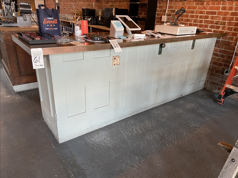 APPROX 2-1/2' X 10' BRUSHED COPPER TOP WOOD BAR (THIS UNIT WAS BUILT IN PLACE, 1 PIECE AND IS VERY HEAVY)