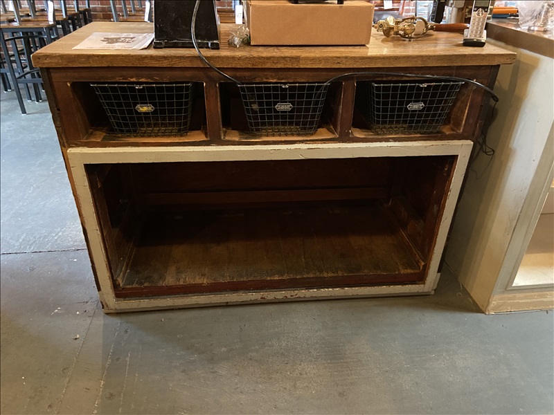 26" X 58" ANTIQUE WOOD COUNTER (MUST BE CAREFULLY TILTED WHEN MOVED AS THERE IS A WATER PIPE UNDER COUNTER)