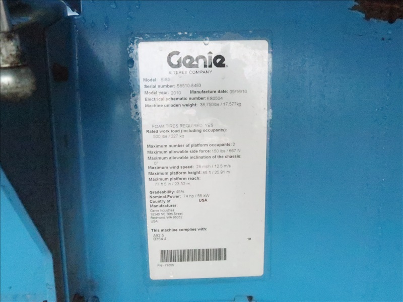 4X4 TELESCOPIC BOOM LIFT, 85' PLATFORM HEIGHT, 500 LB CAPACITY, 110V A/C RECEPTICAL ON PLATFORM, 74 HP DEUTZ TD2011 L041