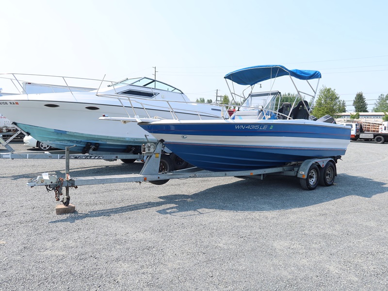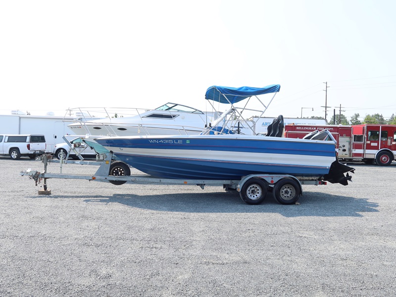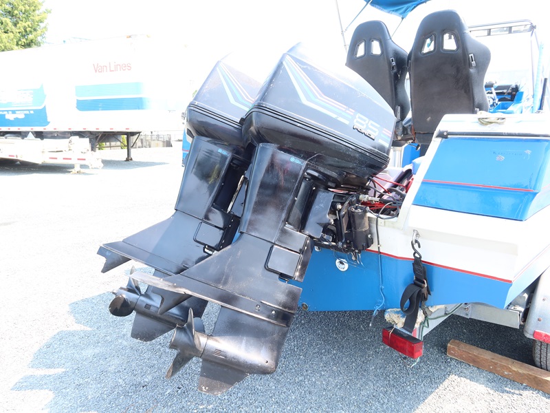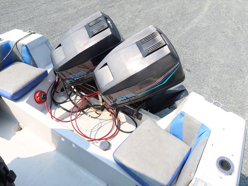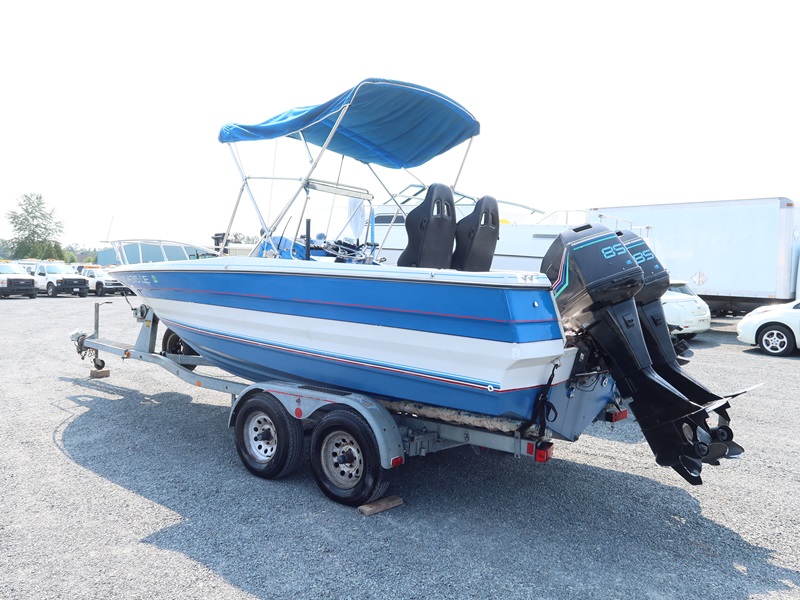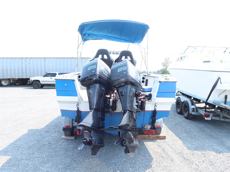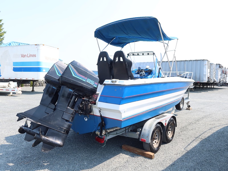 20' OPEN BOW, CONSOLE HELM RUN ABOUT BOAT, TWIN US MARINE FORCE 853X8A 85 HP OUTBOARD ENGINES, CANVAS SUN TOP W/1987 CALKINS ESCORT T/A GALVANIZED BOAT TRAILER, SURGE BRAKES, 205/75R14 S/N: 1CXBP2123HS714384