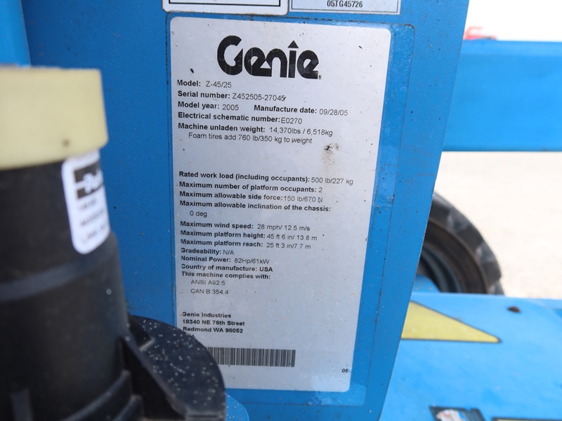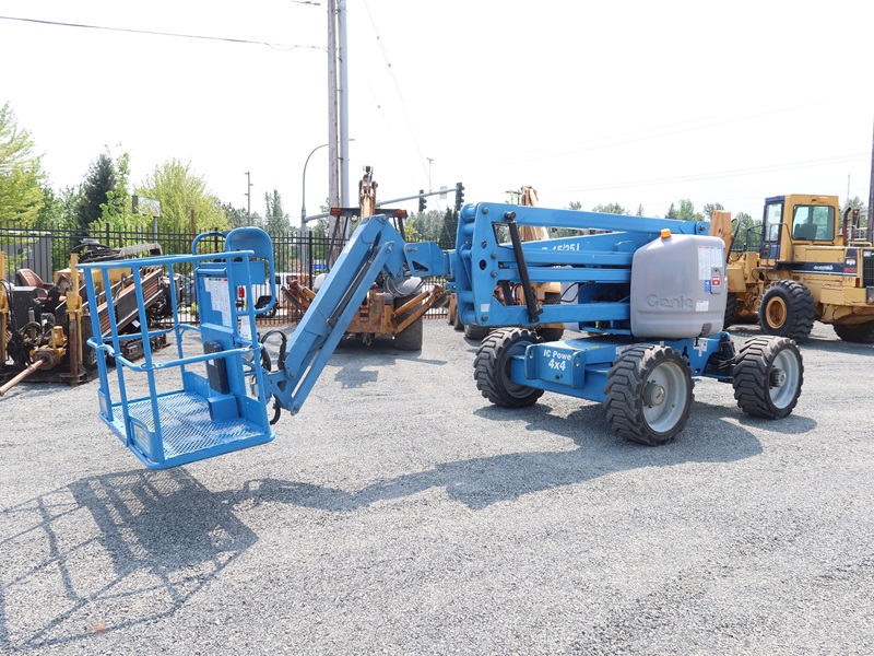 4X4 ARTICULATED BOOM LIFT, 51'6" WORKING HEIGHT, 24'8" HORIZONTAL REACH, 500 LB PLATFORM CAPACITY, 110V RECEPTACLE ON PLATFORM, 82 HP 4 CYL GAS/LPG